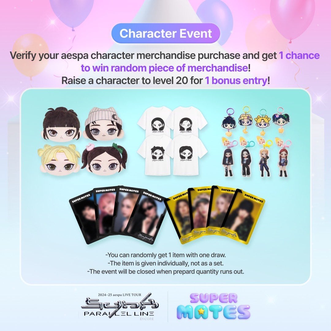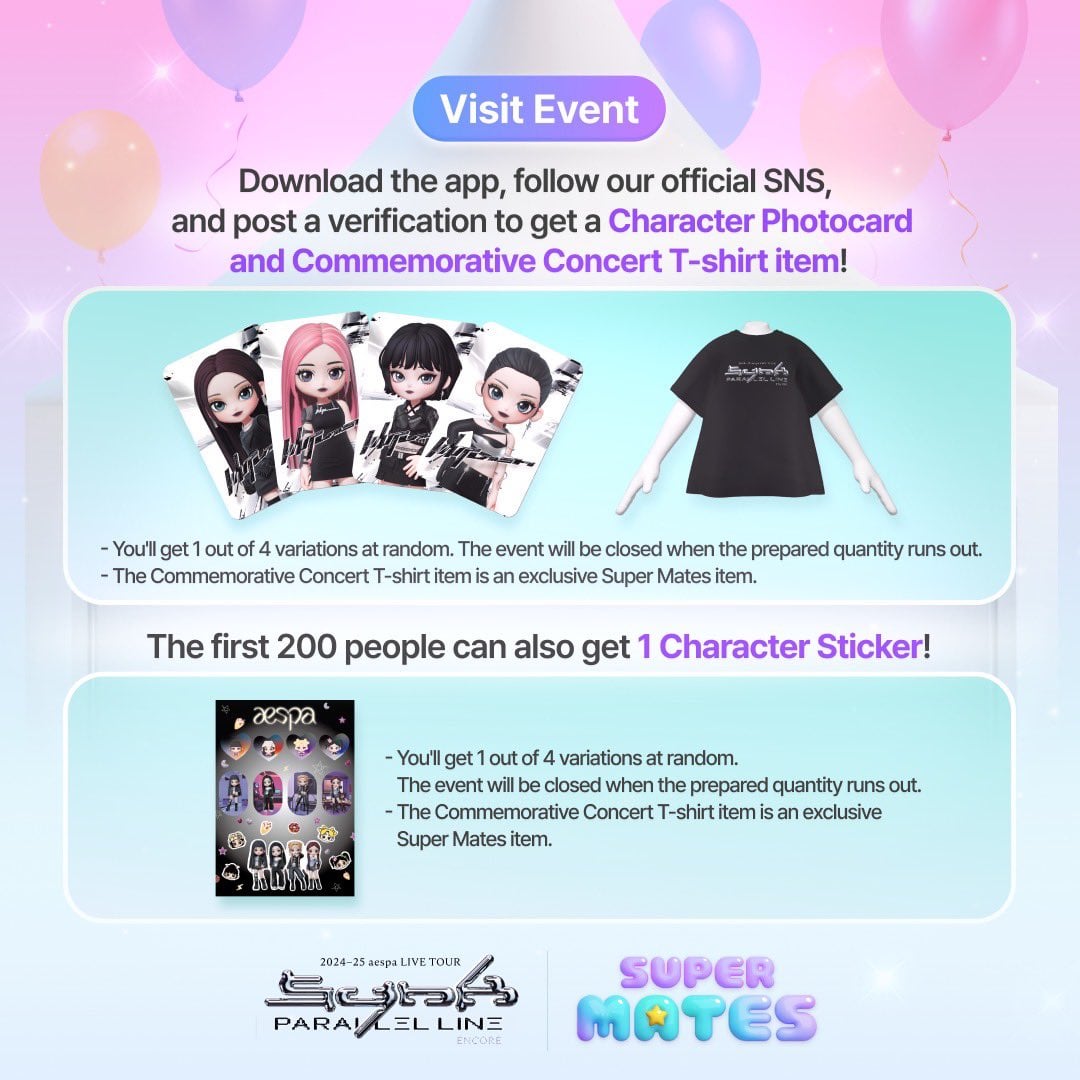 [super_mates_official](https://www.instagram.com/p/DG9yqf6P5QY/)**🎤aespa Encore Concert🎤**Offline Event Preview>On March 15 and 16! Super Mates will operate an offline booth at KSPO DOME where the aespa concert will be held!>Find cute mini aespa character cards, unreleased photo cards only obtainable offline, and all the hot character goods!>Participate in the Super Mates booth event and win limited prizes!🎁—–✅Super Mates Booth operation schedule✅* 3/15 (SAT) 12PM – 5PM (UTC+9) * 3/16 (SUN) 12PM – 4PM (UTC+9)—–📢See the notice for details in Super Mates app.