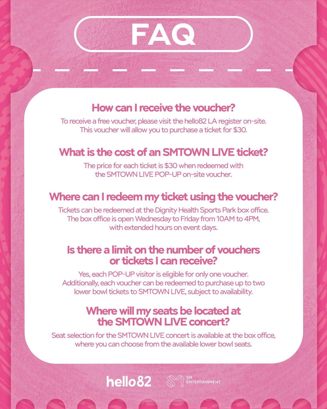 [hello82la](https://www.instagram.com/p/DIe7RRUT0ty/)>SM Entertainment turned 30, so we’re turning up the deals 🎉 Secure your FREE ticket voucher to purchase an SMTOWN LIVE ticket for $30 at the box office!>🗓️ SMTOWN LIVE POP-UP Week 1: 4/18 – 4/20 | 11AM-6PM Week 2: 4/25 – 4/27 | 11AM-6PM>📍 @hello82la 7323 Beverly Blvd, Los Angeles, CA 90036