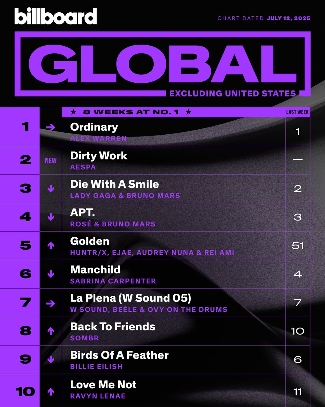 [Billboard Global 200](https://xcancel.com/billboardcharts/status/1942305692443877792) | [Global Excl. U.S.](https://xcancel.com/billboardcharts/status/1942305878067048659)