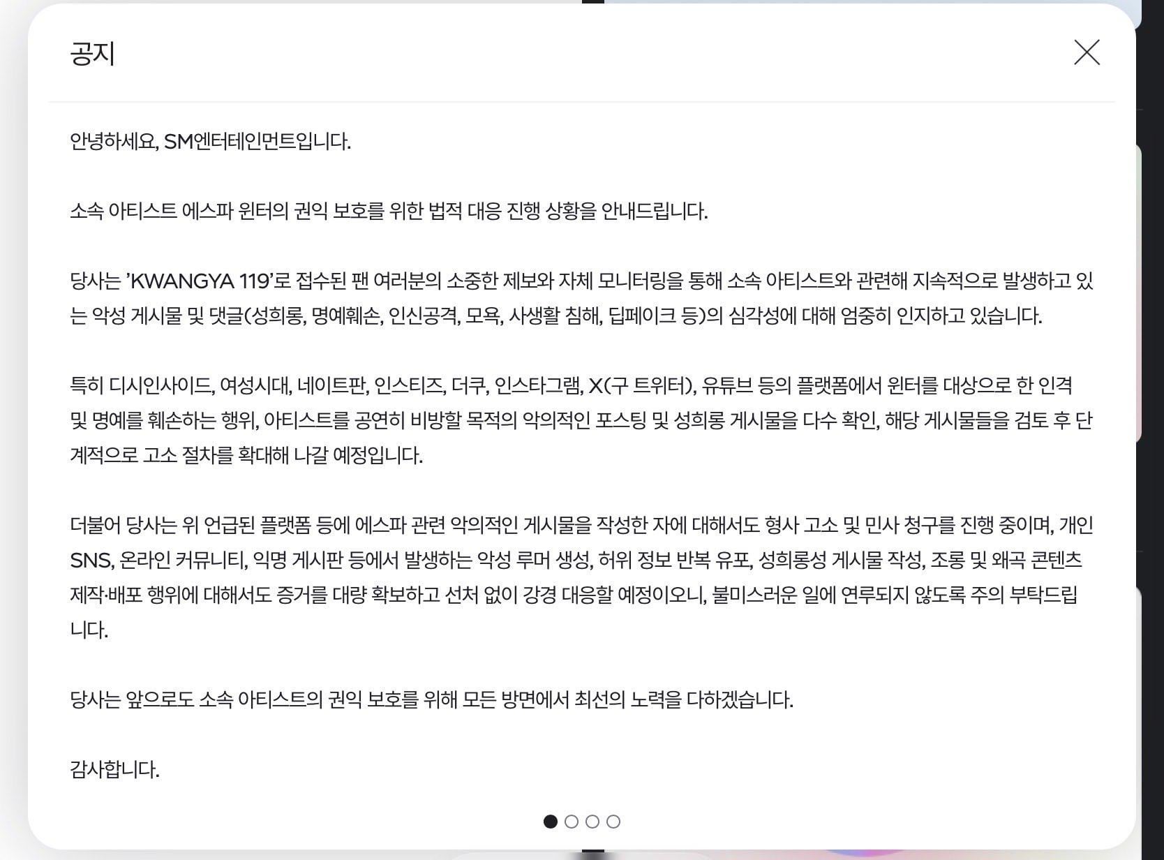 In particular, we have identified numerous instances of defamation of Winter's character and reputation, malicious posts aimed at publicly defaming the artist, and sexually harassing posts targeting Winter on platforms such as DC Inside, Daum Cafe, Natepan, Instiz, Theqoo, Instagram, X (formerly Twitter), and YouTube. After reviewing these posts, we plan to gradually expand our legal action process.