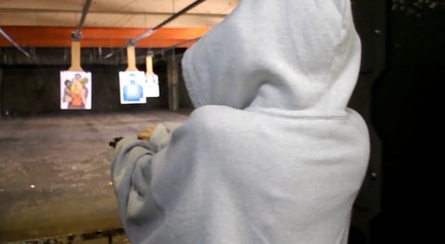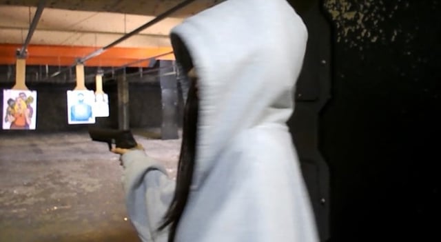 Haha what’s with the hoodie while at the shooting range?! She trying to be a goon?
