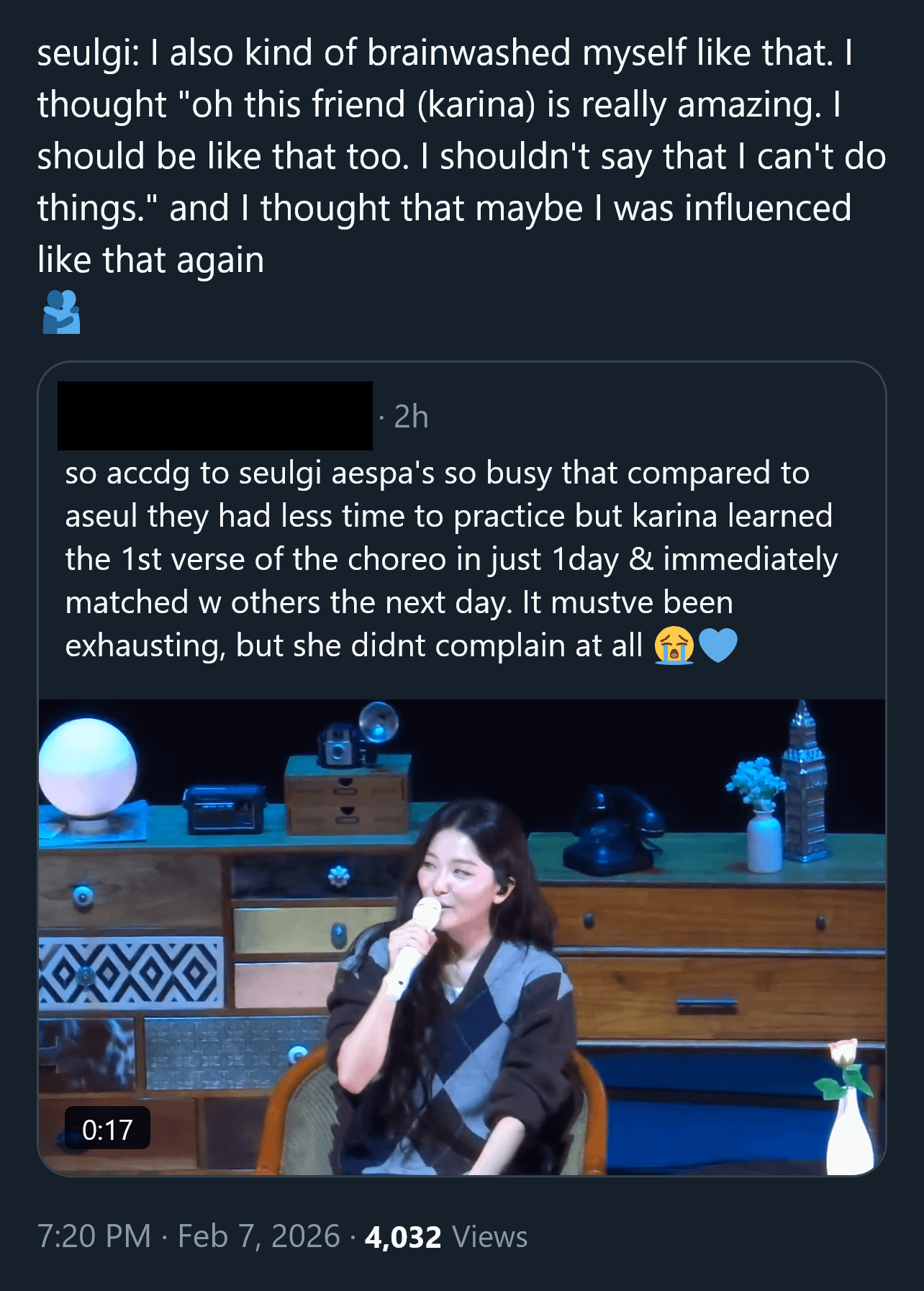 2026-02-07 share 260207 Seulgi on behind the scene story for ‘Chu~♡’ stage and she praises Karina’s work ethic