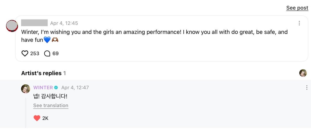 👤: Winter, I’m wishing you and the girls an amazing performance! I know you all with do great, be safe, and have fun💙🫶🏾
