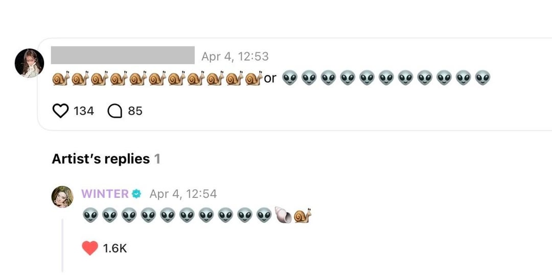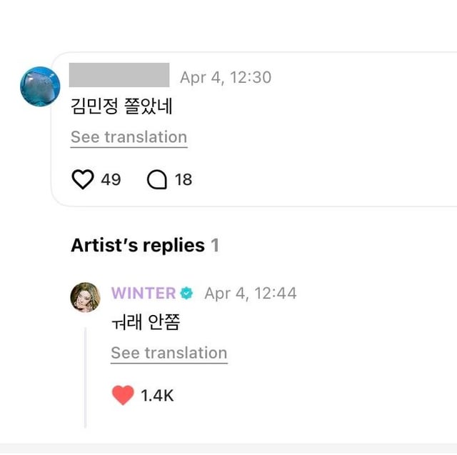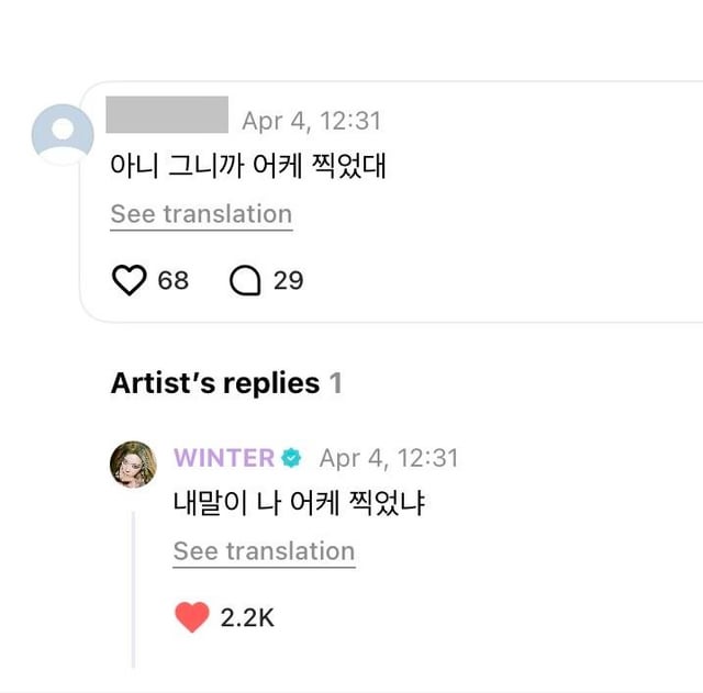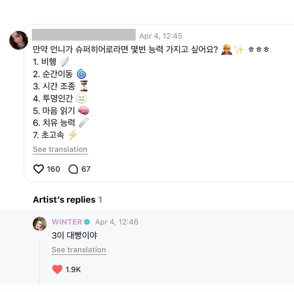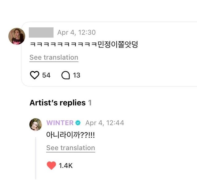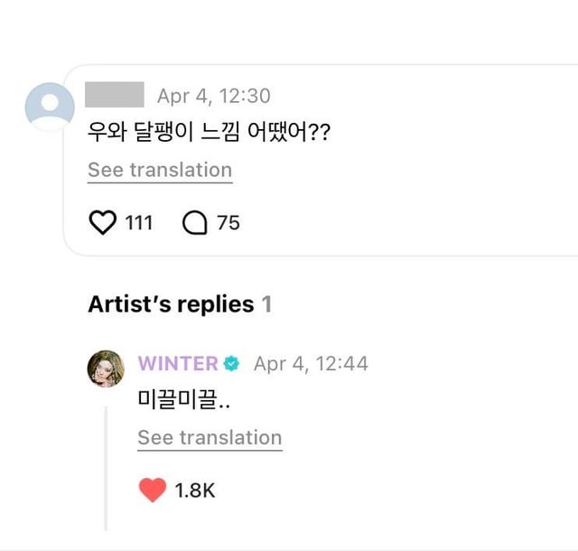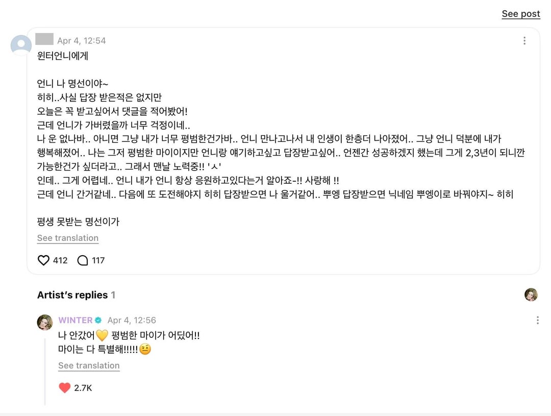 👤: To Winter Unnie. Unnie, it's Myeongseon~ Hehe… Actually, I've never received a reply, but I really wanted to get one today, so I wrote a comment! But I'm so worried that you might have left…I guess I'm unlucky… Or maybe I'm just too ordinary… My life has gotten a whole new level since meeting you… I just became happy thanks to you… I'm just an ordinary person, but I want to talk to you and get a reply… I thought I would succeed someday, but now that it's been 2 or 3 years, I wonder if it's even possible… So I'm trying every day!! 'ㅅ' But… that's hard… Unnie, please know that I'm always cheering for you-!! I love you !! But it looks like you left…
